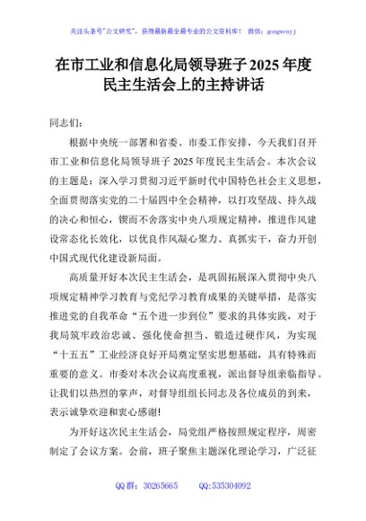 / 在市工业和信息化局领导班子2025年度民主生活会上的主持讲话