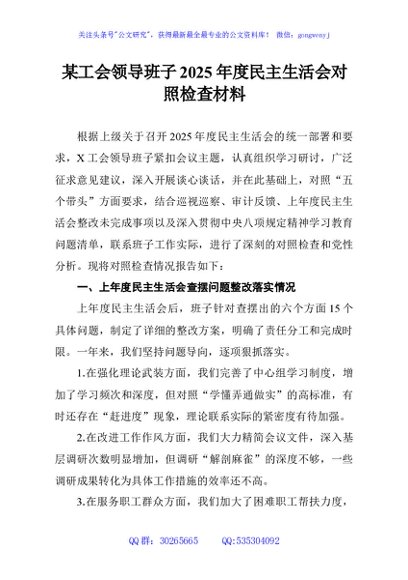 / 某工会领导班子2025年度民主生活会对照检查材料