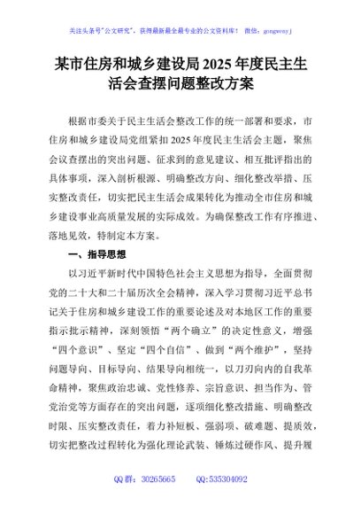 / 某市住房和城乡建设局2025年度民主生活会查摆问题整改方案