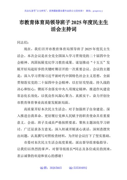 / 市教育体育局领导班子2025年度民主生活会主持词