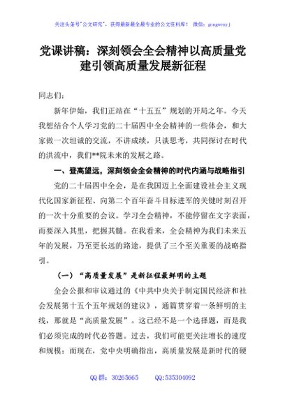 / 党课讲稿:深刻领会全会精神以高质量党建引领高质量发展新征程