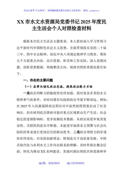 / XX市水文水资源局党委书记2025年度民主生活会个人对照检查材料