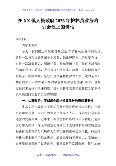 / 在XX镇人民政府2026年护林员业务培训会议上的讲话