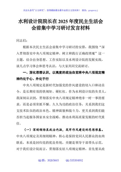 / 水利设计院院长在2025年度民主生活会会前集中学习研讨发言材料