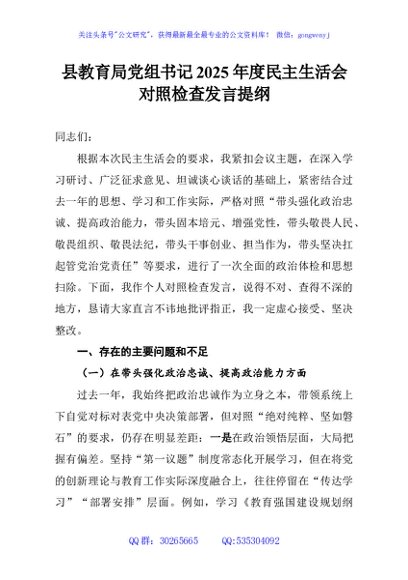 / 县教育局党组书记2025年度民主生活会对照检查发言提纲