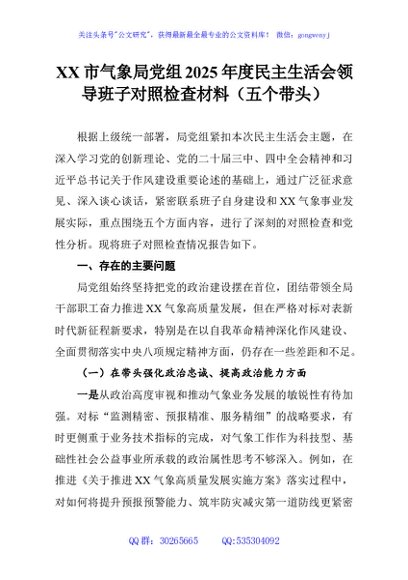 / XX市气象局党组2025年度民主生活会领导班子对照检查材料(五个带头)