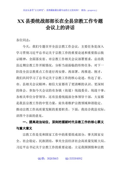 / XX县委统战部部长在全县宗教工作专题会议上的讲话