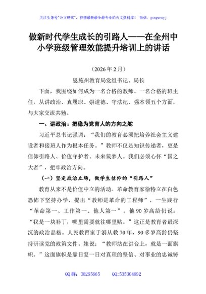 / 做新时代学生成长的引路人——在全州中小学班级管理效能提升培训上的讲话