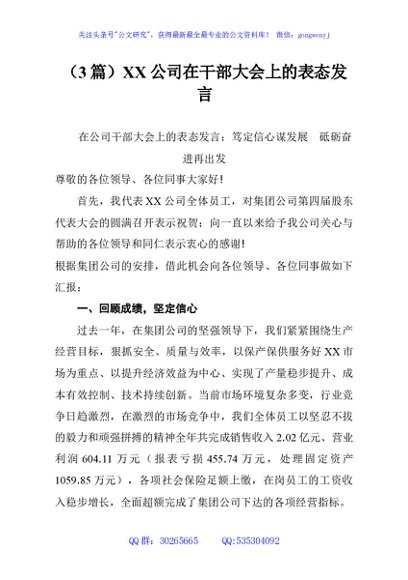 / (3篇)XX公司在干部大会上的表态发言