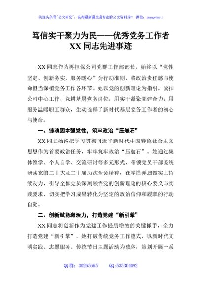 笃信实干聚力为民——优秀党务工作者XX同志先进事迹