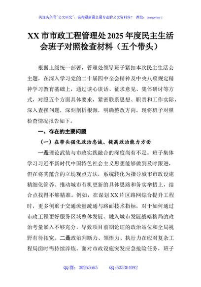 / XX市市政工程管理处2025年度民主生活会班子对照检查材料(五个带头)