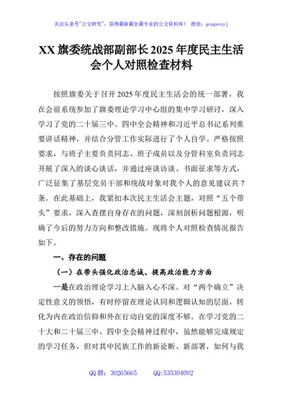 / XX旗委统战部副部长2025年度民主生活会个人对照检查材料