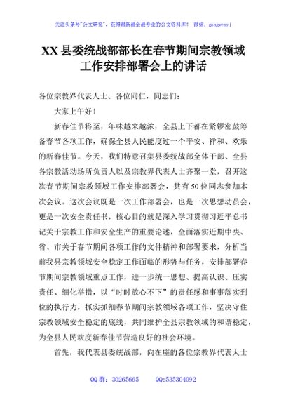 / XX县委统战部部长在春节期间宗教领域工作安排部署会上的讲话