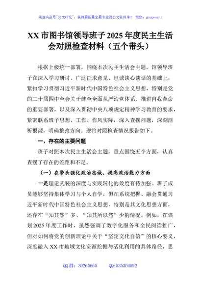 / XX市图书馆领导班子2025年度民主生活会对照检查材料(五个带头)