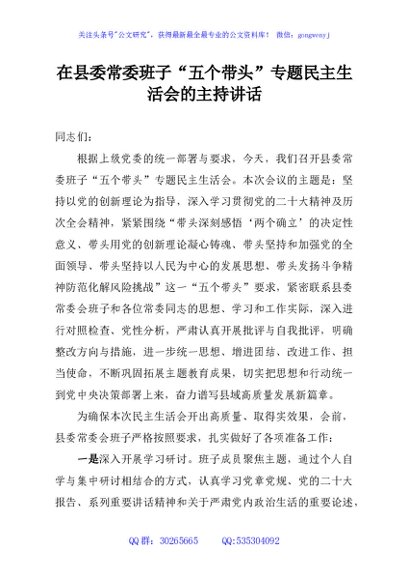 / 在县委常委班子“五个带头”专题民主生活会的主持讲话