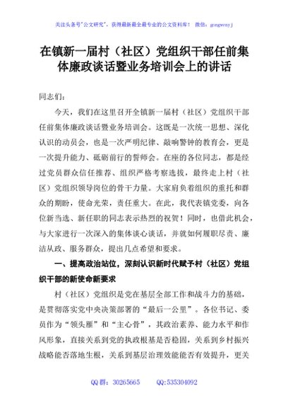 / 在镇新一届村(社区)党组织干部任前集体廉政谈话暨业务培训会上的讲话