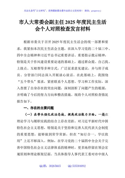 / 市人大常委会副主任2025年度民主生活会个人对照检查发言材料