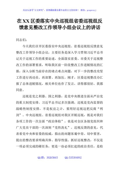 / 在XX区委落实中央巡视组省委巡视组反馈意见整改工作领导小组会议上的讲话