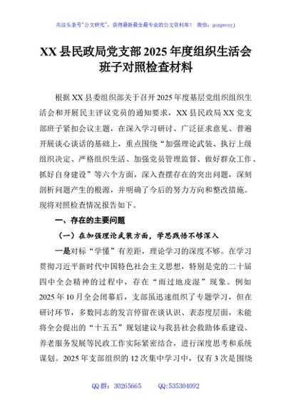 / XX县民政局党支部2025年度组织生活会班子对照检查材料