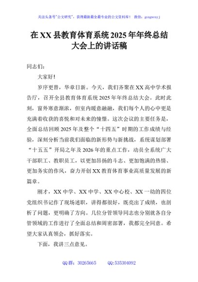 / 在XX县教育体育系统2025年年终总结大会上的讲话稿