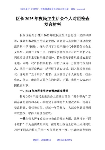 / 区长2025年度民主生活会个人对照检查发言材料