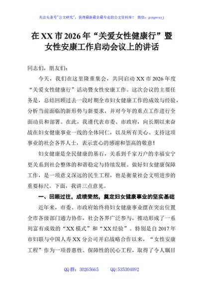 / 在XX市2026年“关爱女性健康行”暨女性安康工作启动会议上的讲话