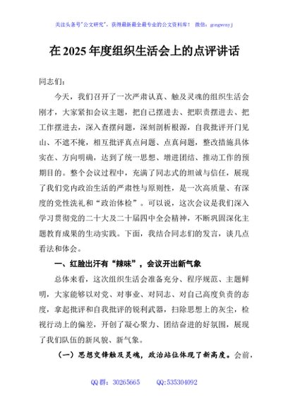 未生成预览图,长按二维码添加 在2025年度组织生活会上的点评讲话 - 公文研究