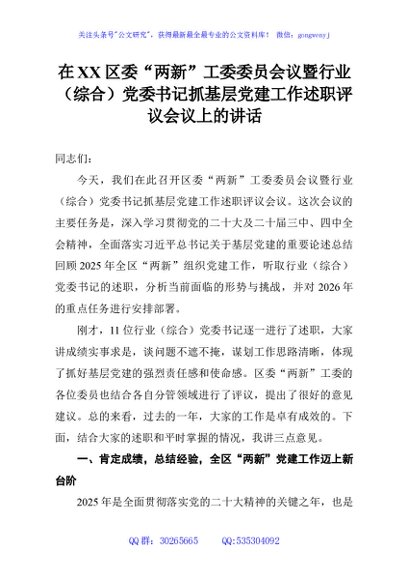 在XX区委“两新”工委委员会议暨行业(综合)党委书记抓基层党建工作述职评议会议上的讲话 - 公文研究