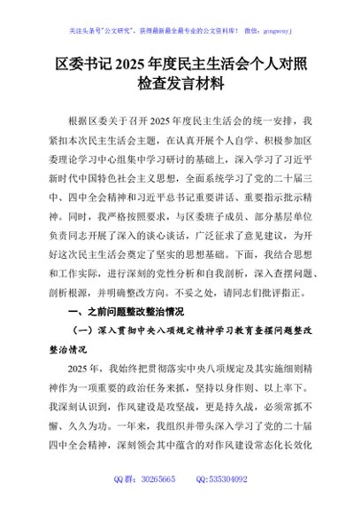 未生成预览图,长按二维码添加 区委书记2025年度民主生活会个人对照检查发言材料 - 公文研究