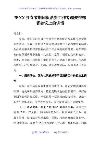 / 在XX县春节期间促消费工作专题安排部署会议上的讲话