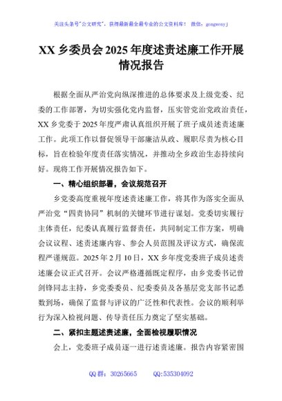 / XX乡委员会2025年度述责述廉工作开展情况报告