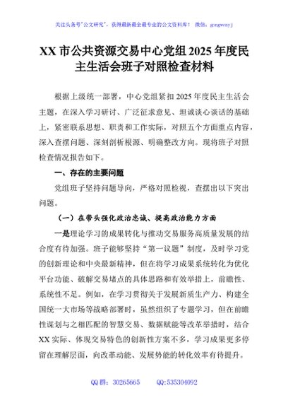/ XX市公共资源交易中心党组2025年度民主生活会班子对照检查材料