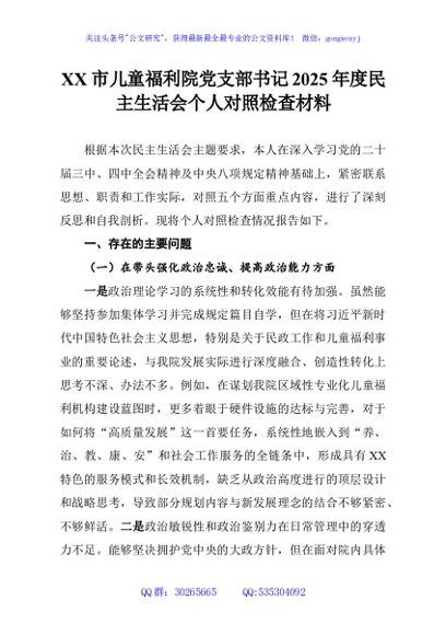 / XX市儿童福利院党支部书记2025年度民主生活会个人对照检查材料