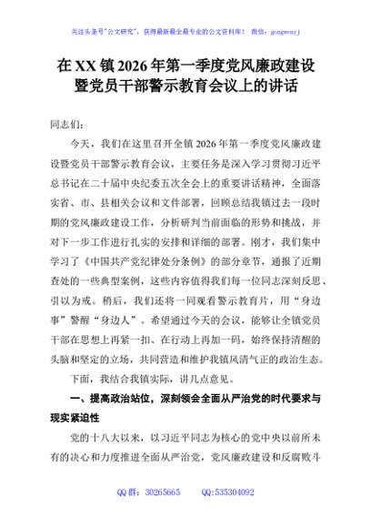 / 在XX镇2026年第一季度党风廉政建设暨党员干部警示教育会议上的讲话