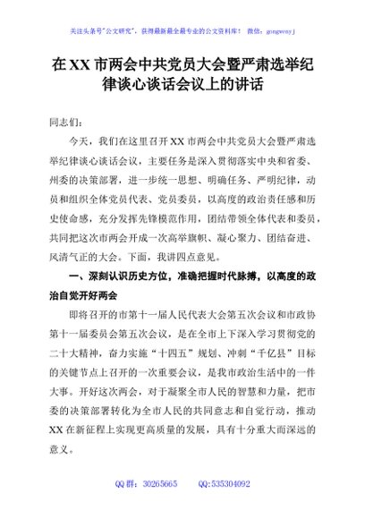 / 在XX市两会中共党员大会暨严肃选举纪律谈心谈话会议上的讲话
