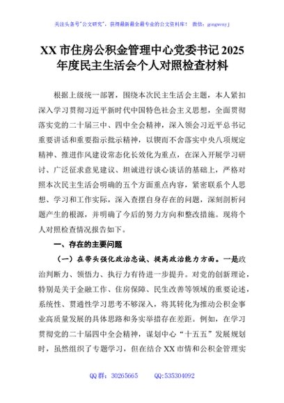 / XX市住房公积金管理中心党委书记2025年度民主生活会个人对照检查材料