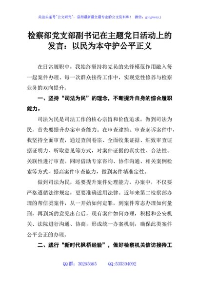 / 检察部党支部副书记在主题党日活动上的发言:以民为本守护公平正义