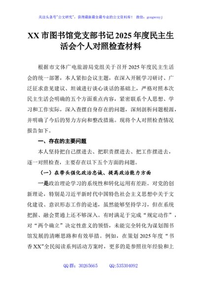 / XX市图书馆党支部书记2025年度民主生活会个人对照检查材料