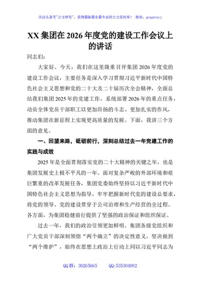 / XX集团在2026年度党的建设工作会议上的讲话