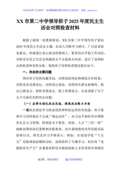 / XX市第二中学领导班子2025年度民主生活会对照检查材料