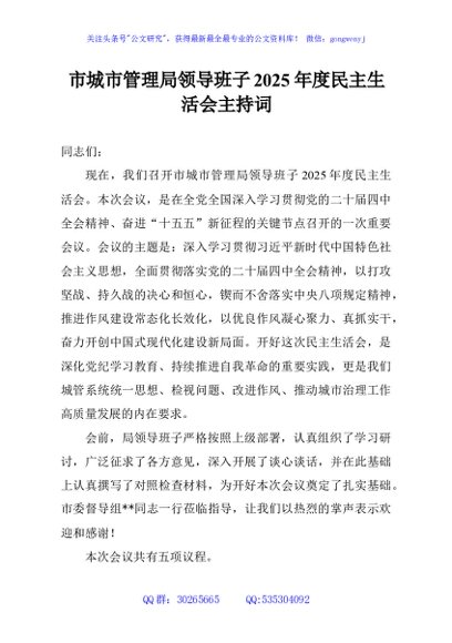/ 市城市管理局领导班子2025年度民主生活会主持词