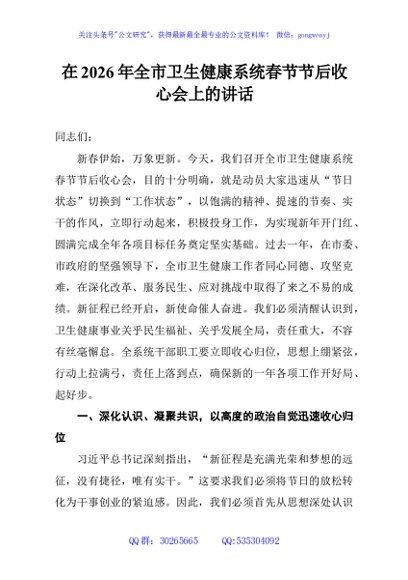 / 在2026年全市卫生健康系统春节节后收心会上的讲话