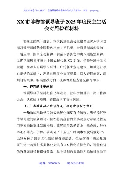/ XX市博物馆领导班子2025年度民主生活会对照检查材料
