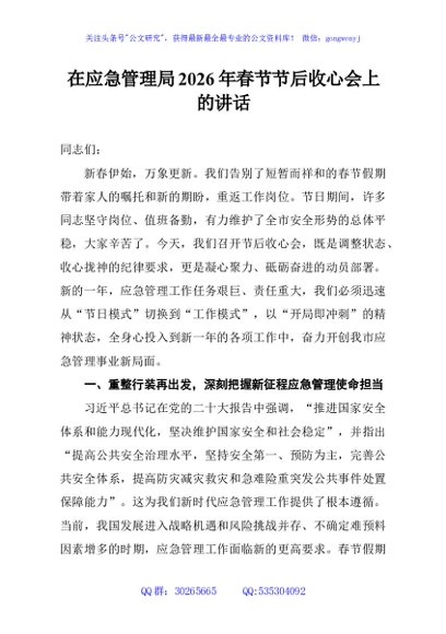 / 在应急管理局2026年春节节后收心会上的讲话