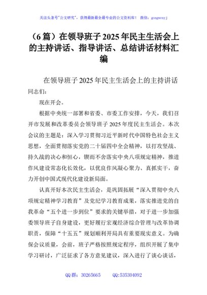 / (6篇)在领导班子2025年民主生活会上的主持讲话、指导讲话、总结讲话材料汇编