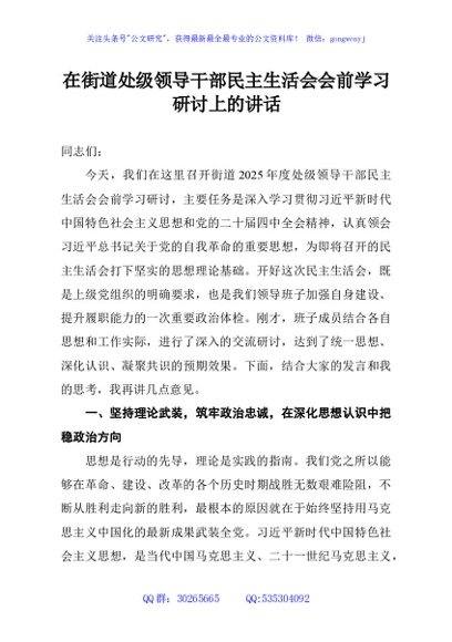 / 在街道处级领导干部民主生活会会前学习研讨上的讲话