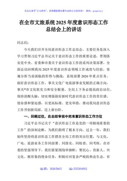 / 在全市文旅系统2025年度意识形态工作总结会上的讲话