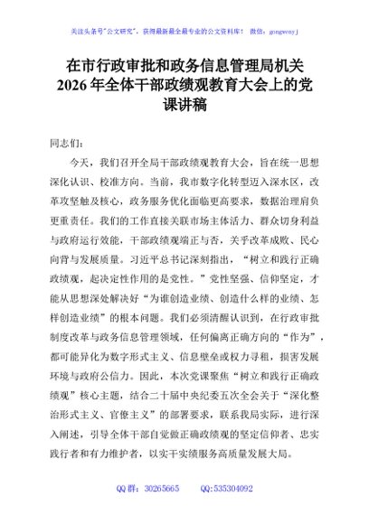 / 在市行政审批和政务信息管理局机关2026年全体干部政绩观教育大会上的党课讲稿