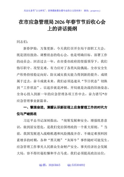 / 在市应急管理局2026年春节节后收心会上的讲话提纲