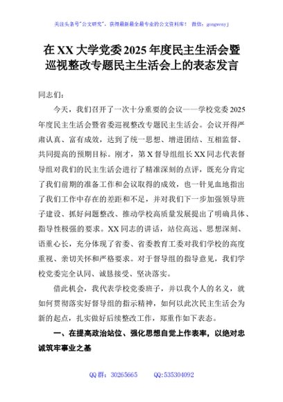 / 在XX大学党委2025年度民主生活会暨巡视整改专题民主生活会上的表态发言